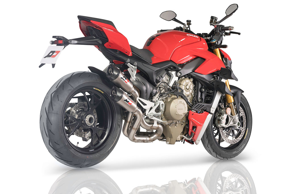 Impianto completo in puro stile SBK per la Ducati Streetfighter V4. L’impianto utilizza la prima parte dei collettori di serie ed ha una configurazione 2 in 2 in 2 con diametri 52mm ed compensatore ad H per bilanciare i flussi tra le due bancate, realizzato con tubazioni in acciaio INOX AISI 304 saldato TIG. I terminali sono della nuova serie Gunshot in titanio con fondello in lega di magnesio pressofuso, tradizionale firma di QD exhaust. Le pedane passeggero possono essere mantenute. Il guadagno è incredibile, +2/3 hp su tutto l’arco di utilizzo e + 6hp di potenza massima.